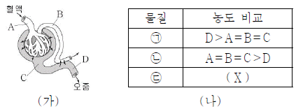 16. 그림 (가)는 신장 기능이 정상인 사람의 오줌 생성 과정을, (나)는 (가)의 A~D에서 물질 ㉠~㉢의 농도를 비교하여 나타낸 것이다. ㉠~㉢은 각각 포도당, 단백질, 요소 중 하나이다.