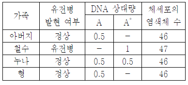 19. 다음은 철수 가족 중 어머니를 제외한 나머지 가족의 어떤 유전병 발현 여부와 이 유전병의 발현에 관여하는 대립 유전자 A와 A*의 DNA 상대량 및 체세포의 염색체 수를 나타낸 것이다.