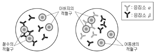 2. 그림은 ABO식 혈액형이 모두 다른 철수의 가족에서 A형인 아버지의 혈액을 각각 철수와 여동생의 혈액과 섞었을 때의 모습을 나타낸 것이다. 그림에 응집원은 나타내지 않았다.