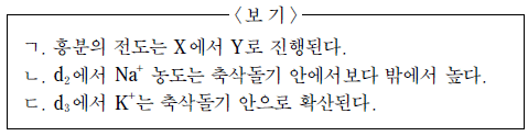 11. 그림은 민말이집 신경 축삭돌기의 일부를, 표는 그림의 두 지점 X나 Y 중 한 곳만을 자극하여 흥분의 전도가 1 회 일어날 때, 네 지점(d1~d4)에서 동시에 측정한 막전위를 나타낸 것이다. 휴지 전위는 -70mV이다.