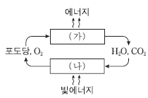 7. 그림은 광합성과 세포 호흡에서의 에너지와 물질의 이동을 나타낸 것이다. (가)와 (나)는 각각 광합성과 세포 호흡 중 하나이다.