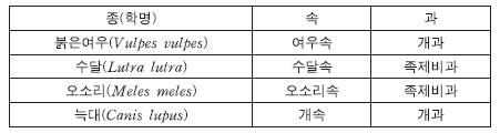 14. 표는 식육목(Carnivora)에 속하는 동물 4 종의 분류 단계를 나타낸 것이다.
