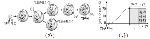 11. 그림 (가)는 세포 내 공생설을, (나)는 지질 시대에서 대기중 산소의 비율 변화를 나타낸 것이다. ㉠~㉢은 각각 남세균, 단세포 진핵생물, 호기성 세균 중 하나이다.