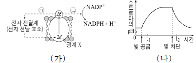 그림 (가)는 광합성에서 전자의 이동 경로를 보여주고, (나)는 빛의 조건에 따른 스트로마의 pH 변화를 보여준다. 이에 따라 보기 중 "ㄴ"이 옳다.
