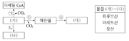 9. 그림은 세포 호흡과 발효 과정의 일부를, 표는 물질 (가)∼(다)를 순서 없이 나타낸 것이다.