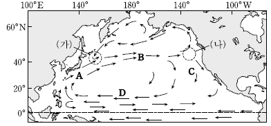 12. 그림은 북태평양의 표층 순환을 이루는 해류 A~D를 나타낸 것이다.