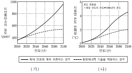 2. 그림 (가)와 (나)는 IPCC(정부 간 기후 변화 협의체)가 두 가지 온실 가스 배출 시나리오를 바탕으로 제시한 2100 년까지 대기의 CO2 농도와 지표면 온도의 변화량을 각각 나타낸 것이다.