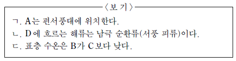 12. 그림은 남태평양의 주요 표층 해류가 흐르는 해역 A~D를 나타낸 것이다.