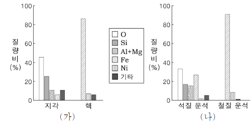 2. 그림 (가)는 지구의 지각과 핵을, (나)는 석질 운석과 철질 운석을 구성하는 원소의 질량비를 나타낸 것이다.