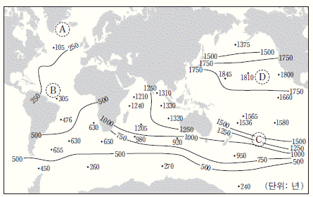 11. 그림은 수심 4000m 해수의 연령 분포를 나타낸 것이다. 해수의 연령은 해수가 표층에서 침강한 이후부터 현재까지 경과한 시간을 의미한다.
