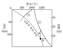 7. 그림은 지하의 온도 곡선과 두 암석의 용융 곡선을 나타낸 것이다. 용융 곡선 ㉠과 ㉡ 중 하나는 현무암, 다른 하나는 물을 포함하는 화강암에 해당한다.