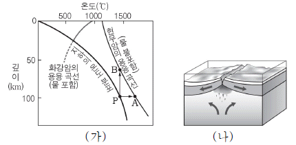 9. 그림 (가)는 깊이에 따른 지하의 온도 분포와 암석의 용융 곡선을, (나)는 해령 부근의 단면을 나타낸 것이다.