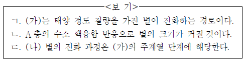20. 그림 (가)는 H-R도 상에 별의 진화 경로를, (나)는 이 진화 경로 상에 있는 어떤 별의 내부 구조를 나타낸 것이다.