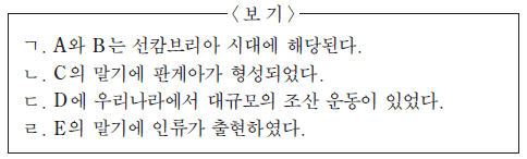 4. 그림은 시생 이언, 원생 이언, 고생대, 중생대, 신생대를 상대적인 길이에 따라 A~E로 순서 없이 나타낸 것이다.