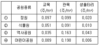19. 「조경설계기준(KDS 34 40 10:2024)」상 도시공원의 조성녹지면적을 기준으로 한 권장식재밀도를 바르게 연결한 것은?