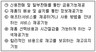 19. 아래 글상자의 내용 중 소비자를 위한 소매상의 기능으로 옳은 것만을 나열한 것은?