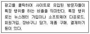 60. 아래 글상자의 괄호에 공통적으로 들어갈 디지털 마케팅에서의 성과지표로 가장 옳은 것은?