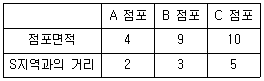 32. S지역에 거주하는 소비자들이 이용할 수 있는 점포가 3개만 존재한다. 다음 자료와 Huff모델을 사용하여 소비자들의 이용 확률이 가장 높은 점포와 그 확률을 구한 것으로 옳은 것은? (단, 소비자들의 점포면적에 대한 민감도는 +2, 거리에 대한 민감도는 –2이다.)