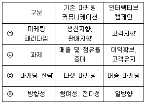 59. 기존의 마케팅 커뮤니케이션과 인터랙티브 캠페인의 특징을 비교한 내용으로 옳지 않은 것은?