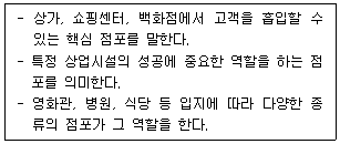 31. 다수의 임대점포로 구성되는 대형상가인 쇼핑센터는 임차인 믹스(tenant mix)가 중요하다. 일반적으로 쇼핑센터의 성격을결정짓고 다수의 고객을 끌어들이는 중심적 역할을 하고, 보통 쇼핑센터에서 매장면적을 크게 점유하여 일반에게 지명도가 높은 상징적 점포를 의미하는 것은?