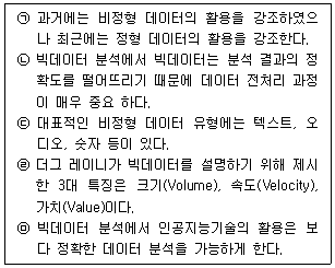 71. 아래 글상자에서 빅데이터에 대한 설명으로 옳지 않은 것을 모두 나열한 것은?