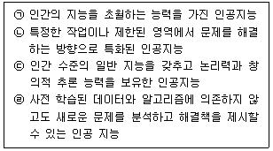 88. AI는 고도화 수준에 따라 '제한적 인공지능(ANI)', '범용 인공지능(AGI)', '초인공지능(ASI)'으로 구분할 수 있다. 아래 글상자의 내용 중 AGI에 해당되는 설명을 모두 나열한 것은?