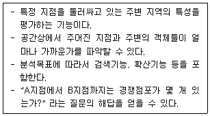 30. 지리정보시스템(GIS)의 주요 기능 중에서 아래 글상자에서 제시하는 내용에 해당하는 것은?