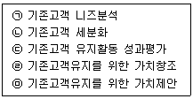 41. 아래 글상자의 내용으로 기존고객을 유지하기 위한 CRM 실행프로세스를 바르게 나열한 것은?
