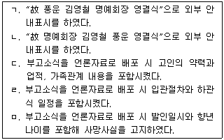 7. 사장님의 아버지인 회사 설립주 김영철 명예회장의 호는 풍운이다. 다음 중 회사장으로 치러지는 김영철 명예회장의 장례 절차를 준비하는 비서의 업무 수행 중 적절하지 않은 것으로만 묶여진 것은?