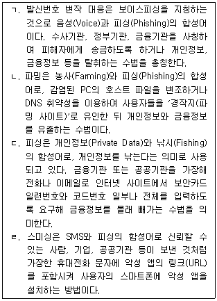 73. 다음 중 전자금융 사기와 관련 용어에 대한 설명으로 틀린 것을 모두 고르시오.