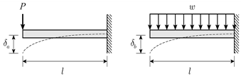 17. 그림과 같은 캔틸레버보에서 자유단에 집중하중(P)이 작용할 때의 자유단 처짐(δa)과 등분포하중(w)이 작용할 때의 자유단 처짐(δb)이 동일할 경우, 등분포하중(w)의 크기는? (단, 두 보의 휨강성은 EI로 동일하며, 선형탄성거동 하고 자중을 포함한 기타 하중의 영향은 무시한다)