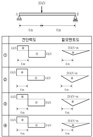 20. 그림과 같은 조건을 갖는 단순보의 전단력도와 휨모멘트도로 옳은 것은? (단, 보의 자중은 무시한다)