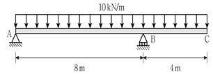 8. 그림과 같이 내민보에 등분포하중 10kN/m가 작용할 때, A 지점의 수직반력[kN]은? (단, 보의 자중은 무시한다)