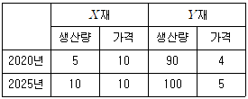 17. 어느 폐쇄경제에서 생산하는 두 최종 재화의 생산량 및 가격이 다음과 같다고 할 때, 2025년의 GDP디플레이터는? (단, 실질GDP 작성을 위한 기준연도는 2020년이며, X재와 Y재 외의 재화는 생산하지 않는다)