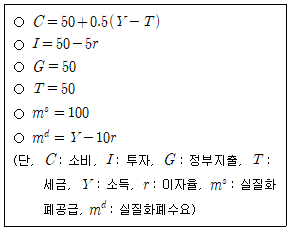 7. 다음과 같이 어느 폐쇄경제의 기본 정보가 주어졌다고 할 때, 재화시장과 화폐시장의 균형을 동시에 달성하는 소득은?