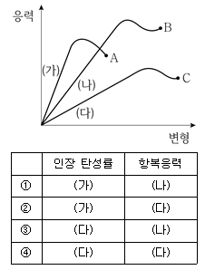 18. 그림과 같이 고분자 (가), (나), (다)가 응력(stress)-변형(strain) 곡선을 따르며, 초기 탄성 구간에서는 훅의 법칙(Hooke's law)을 따른다. 인장 탄성률(elastic modulus)과 항복응력(yield stress)이 가장 큰 고분자를 바르게 연결한 것은? (단, A, B, C는 각 고분자의 파괴점이다.)
