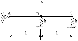 17. 다음 그림과 같은 강성보(rigid beam)가 A점은 핀(pin)으로, B점과 C점은 스프링상수 k인 스프링으로 지지되어있다. 이 보의 A점의 수직반력은?